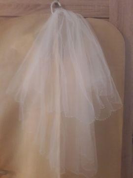 Suknia ślubna w kolorze ecru. Rozmiar 36/38. Ozdobna koronka na rękawach,pasku i z tyłu. Na pasku ozdobne,mieniące się koraliki. Zapinana na zamek i guziczki perłowe. Bardzo wygodna i zwiewna. Dól pięknie się układa w ruchu. Wygodna do siedzenia i tańczenia. Do kompletu delikatny welon w kolorze ecru z koralikami (podobnyni jak na pasku sukni) i szal zrobiony z takiego samego materiału jak dół sukni - gratis.