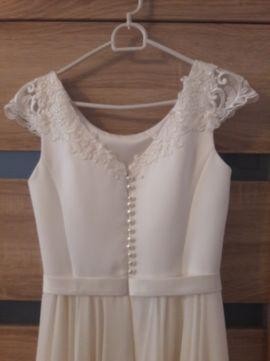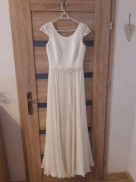 Suknia ślubna w kolorze ecru. Rozmiar 36/38. Ozdobna koronka na rękawach i z tyłu. Na pasku ozdobne,mieniące się koraliki.