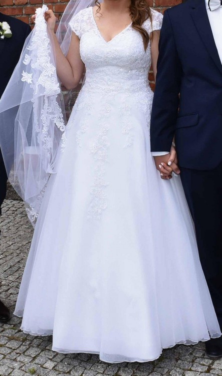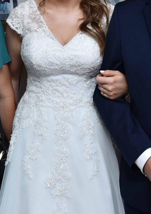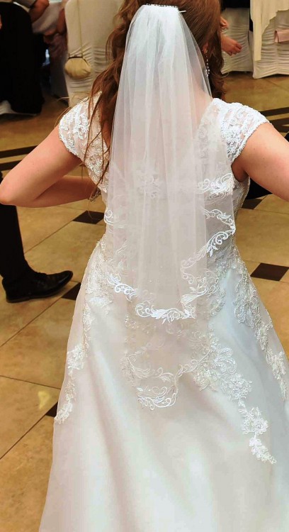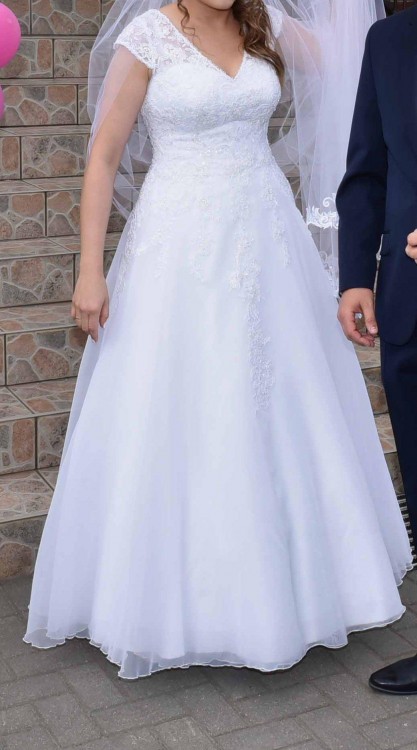 Sprzedam suknie śubna, biala rozmiar 40/42, wzrost 173cm+7cm obcas, kolekcja Agnes Bridal Dream model: 16143T po personalnych przeróbkach w salonie( zmieniono: zapiecie za zamek, dosztyto rekawki motylki, usunieto ozdobe pod biustem) dołączam 2 welony jeden 2.5m z ozdobna koronka, drugi krotki z koronka. Cena 2500zl z kolem i 2 welony. Suknia z salonu Agnes w Gdyni koszt nowej to 3700zl, welon 2.5m-500zl, krotki welon 360zl, kolo rozmiar M 100zl dorzucam ozdoby z kryształków jako pasek