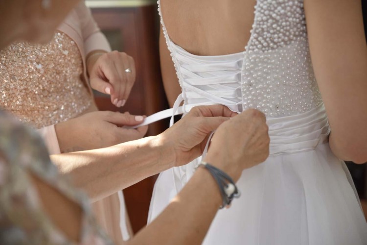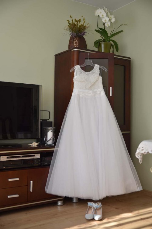 Największą ozdobę sukni stanowi góra z ręcznie przyszywanymi perełkami i koralikami oraz wiązany gorset, pięknie eksponujący plecy.
