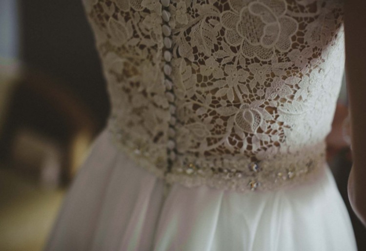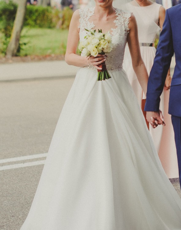 Suknia została zakupiona w salonie Amber w Bydgoszczy. Uszyta jest z lekkiego, zwiewnego materiału, świetnie się układa. Góra wykonana z wysokiej jakości koronki, która dopasowuje się do sylwetki. Z tyłu zapinana na guziczki. W pasie wykończona ozdobnymi koralikami. Dół sukni uszyty z szerokich pasów, które rozszerzają się ku dołowi i pięknie wyglądają w ruchu. Suknia cudownie prezentuje się na sesji zdjęciowej, gdyż można odsłonić nogę :)