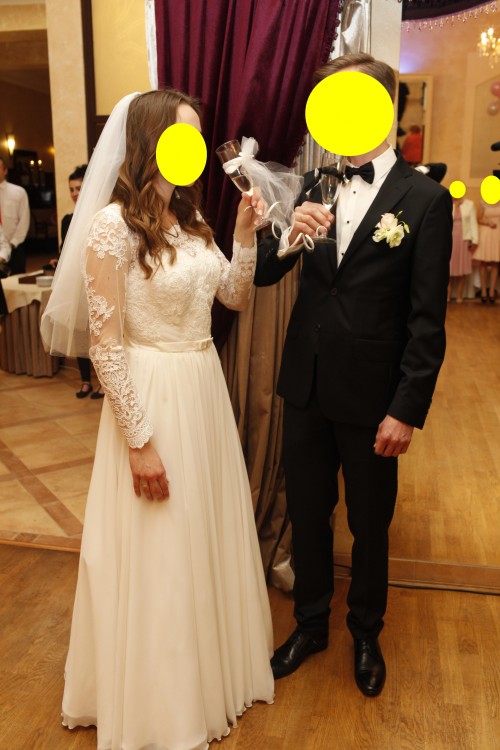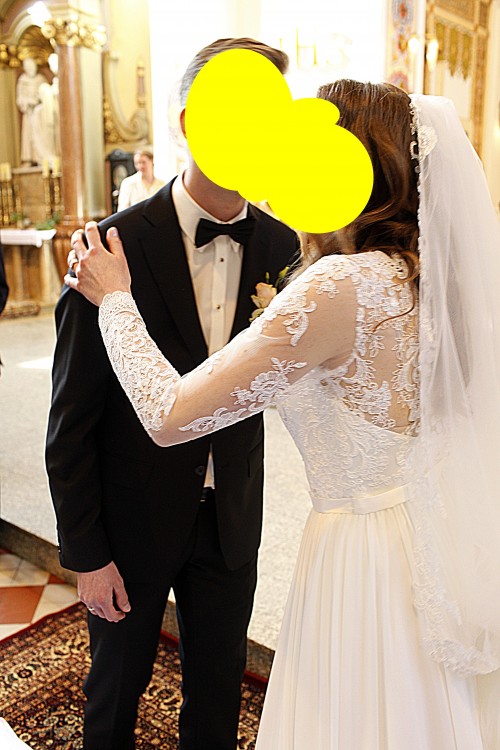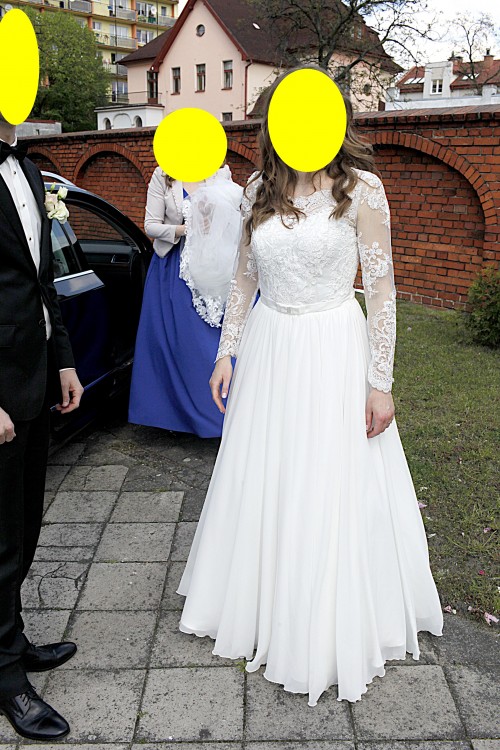 Sprzedam suknię ślubną w stylu Empire, kolor ivory, rozmiar 38. Suknia jest szyta na miarę. Dół sukni wykonany jest z szyfonu natomiast góra z oryginalnej włoskiej koronki (sprowadzana z Padwy). Suknia była użyta do ślubu (maj 2017) oraz na sesję zdjęciową. Dołączam koronkowy welon w stylu hiszpańskim oraz krótki welon na wesele. Osoby zainteresowane proszę o kontakt.