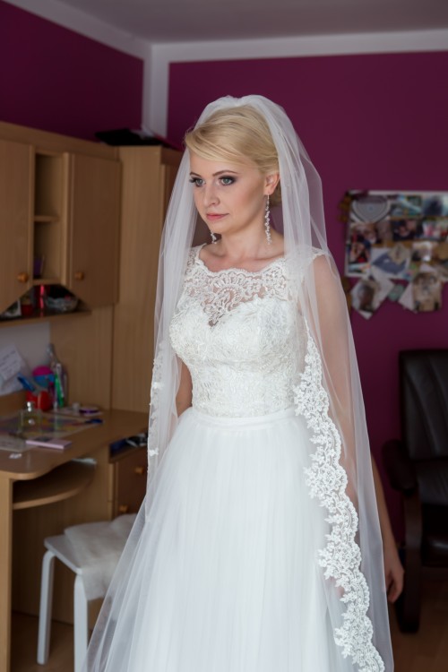 Mam do sprzedania suknię ślubną w kolorze śmietankowym, do niej mam 2,6 metrowy welon obszyty tą samą koronką. Suknia szyta na miarę.