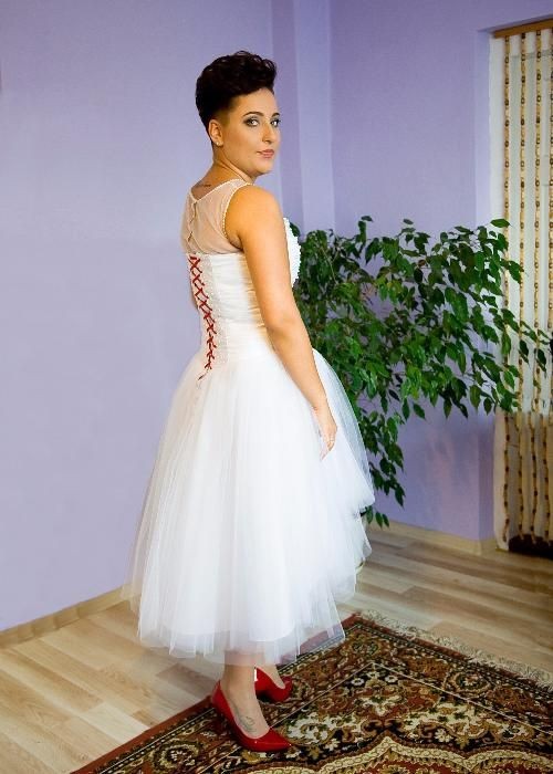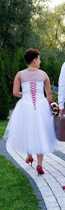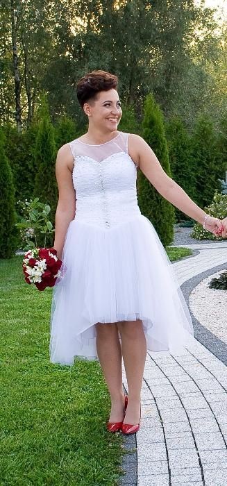 Witam. Mam do sprzedania suknię ślubną :-) Suknia jest asymetryczna, przód przed kolano tył długości 7/8. Góra sukienki ozdobiona białymi koralikami i delikatnymi cyrkoniami. Dół tiulowy. Sznurek przy gorsecie w kolorze czerwonym. Rozmiar 38-40. Niestety sukienka nie posiada tiulowego bolerka jak na zdjęciu (jest z odkrytymi ramionami). Suknia jest bardzo wygodna do noszenia jak i tańca. Idealnie komponuje się z trampkami ;-)