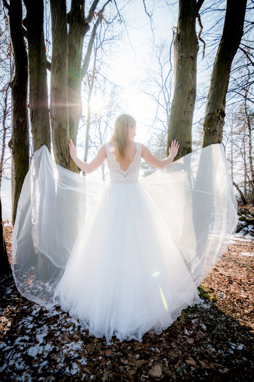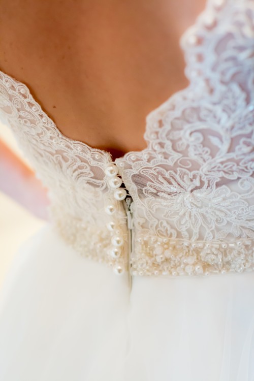 Suknia w najmodniejszym obecnie kolorze „of white” – jasne ecru. Suknia jest niepowtarzalna i pięknie się prezentuje. Góra ręcznie wyszywana pięknym wzorem koronkowym zdobionym dodatkowo perełkami i drobnymi cekinami. Plecy sukni w większości odkryte, jak widać na zdjęciu. Suknia wyposażona jest w 3 koła. Dół sukni składa się z kilku warstw delikatnych materiałów, co sprawia, że idealnie układa się w tańcu. Do sukni dokładam również długi prosty welon. Suknia jest niezwykle subtelna i zjawiskowa.