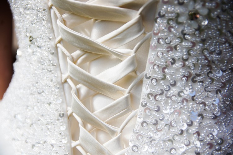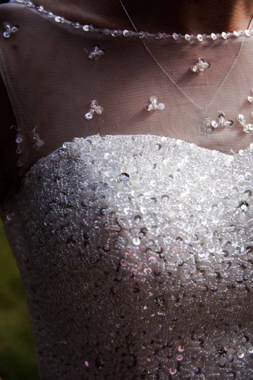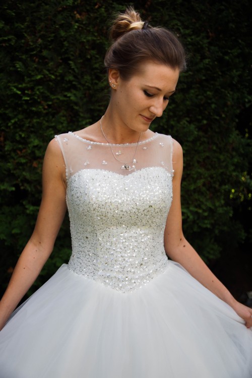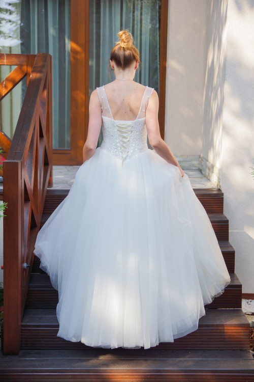 Gorset jest ozdobiony delikatnymi kryształkami, cekinami oraz perełkami. Zapinany od wewnątrz „jak biustonosz” a od zewnątrz tasiemką. Wewnątrz dopięty jest push up (można go zostawić lub odpiąć). Szyta na miarę ale zapięcie gorsetu pozwala na idealne dopasowanie się do każdej sylwetki.
