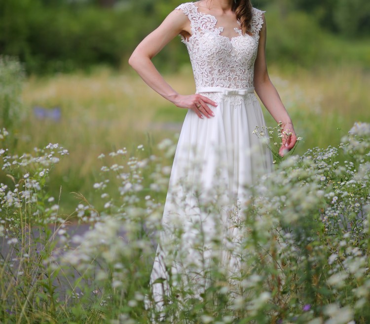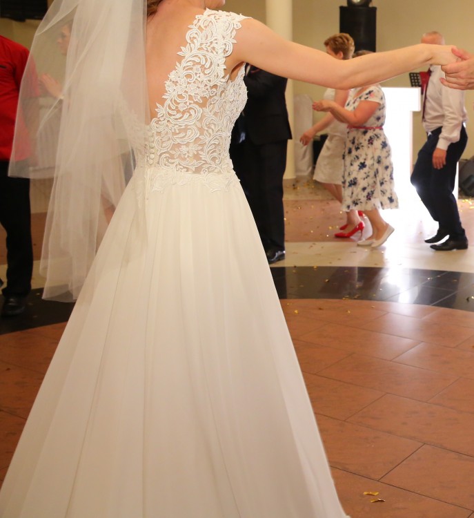 Sprzedam suknię ślubną Maggio Ramatti. Biust 87, talia 69, szyta na wzrost 171 cm +9 cm obcas. Plecy w kształcie litery V, bez sznurowania, cieliste miseczki. Długi welon obszyty koronką. Proszę o kontakt po godzinie 16:00.