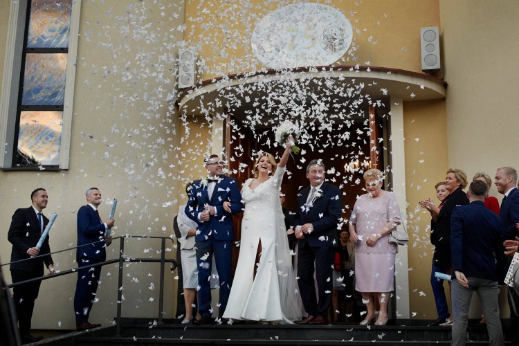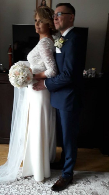 Rozmiar sukni to 42/44. Biodra 103 cm, talia 86 cm. Suknia z tyłu wyszywana jest wzdłuż suwaka kamyczkami swarovskiego, około 50 cm trenu, który swobodnie się podpina. Dodatkowo do sukni jest welon około 2,5 metra. Dół sukni jest z lejącego materiału,który pozwala ukryć niedoskonałości figury. Góra jest podszyta materiałem, nie prześwitująca. Na lewej nodze jest rozporek. Suknia zachwyciła gości swoją prostotą, a zarówno elegancją. Suknia wyprana w pralni chemicznej. Suknia kosztowała 8000 zł., a teraz czeka na szczęśliwą nową właścicielkę za 3300 zł - cena do negocjacji.