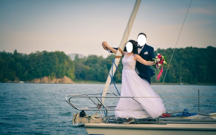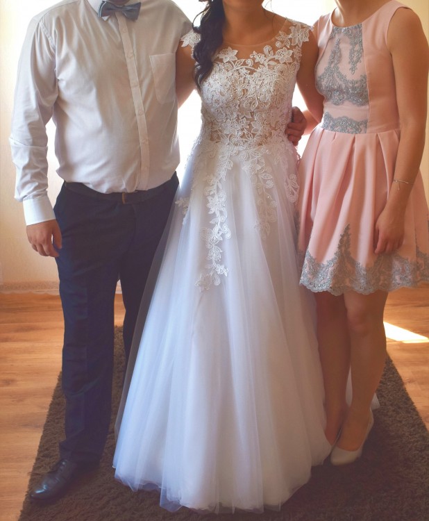 Sprzedam piękną suknię ślubną. Suknia koloru białego, szyta na miarę w salonie sukien ślubnych Erica w Krośnie – rozmiar 36/38, wzrost 165 cm + 8 cm obcas. Zakupiona w lipcu 2017 (ślub sierpień 2017). Góra wykonana z pięknej koronki z kryształkami ręcznie nakładanej na przeźroczystej siateczce, dół tiulowy. Plecy w kształcie litery V zdobione guziczkami, wszyty biustonosz miseczka B75. Suknia pięknie układa się w tańcu i jest bardzo lekka. Cena do negocjacji ze względu na niewielką dziurkę w dolnej warstwie tiulu (warstwy tiulu nakładają się na siebie i nie jest to widoczne). Suknia została założona dwa razy – podczas ślubu i pleneru. Zapraszam do przymierzenia :)