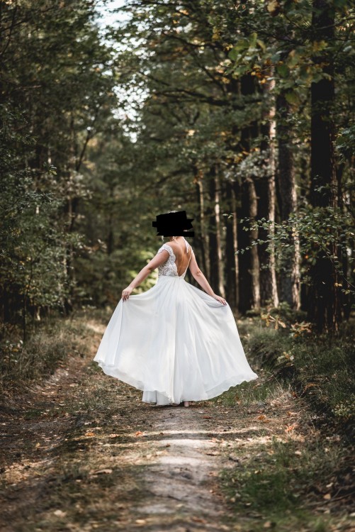 Witam. Sprzedam piękną suknie ślubną projektu Agnieszki Światły. Model to Felicia w rozmiarze 36. Została uszyta na wzrost 170 cm plus 5-6 cm obcas. Kolor Ivory. Góra sukni jest koronkowa, rękawki lekko opadają na ramiona, które trzyma niemal niewidoczna siateczka. Wszyte zostały miseczki w rozmiarze C, które bez problemu można odpruć. Plecy są w kształcie litery V. Dół sukni to muślin, który pięknie się układa. Posiada rozciecie po lewej stronie.