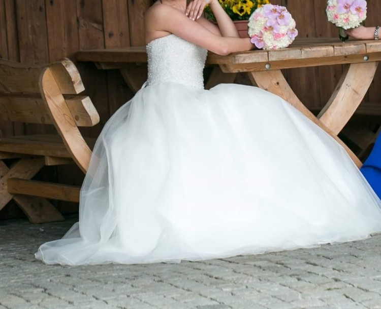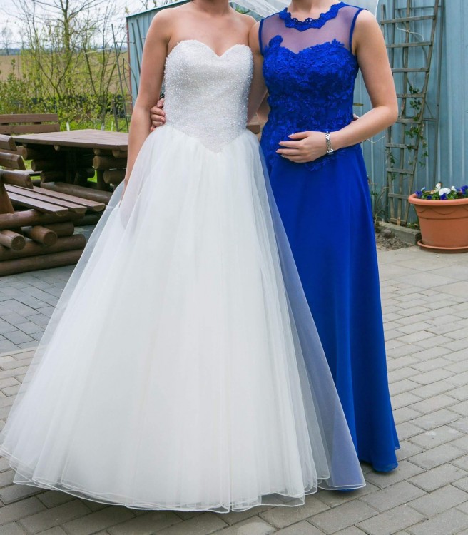Sprzedam suknię ślubną kolor złamana biel, rozmiar 36, gorset wiązany. Suknia idealna na wzrost ok. 165 cm + 10 cm obcas. Gorset wyszywany różnej wielkości kryształami Swarovskiego, lekko wycięty na biodra dzięki czemu pomimo braku ramiączek suknia jest wygodna, idealnie przylega i trzyma się na ciele. Dół sukni w kształcie litery A.