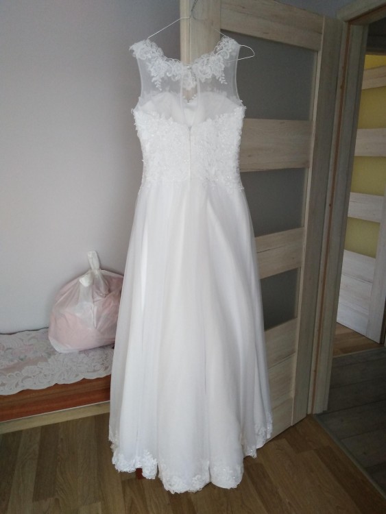 Gorset w serduszko w całości pokryty koronką z delikatnymi cekinami. Tiulowe ramiączka w łódkę. Z tyłu wycięcie w kształcie litery V. Zapięcie na suwak. Spódnica w kształcie litery A zakończona koronką. Dół sukni przepięknie się układa podczas robienia obrotów, co zresztą będzie widać na zdjęciach. Suknia jest w rozmiarze 38, dokładniejsze wymiary podam zainteresowanym. Proponuję 1000zl + dorzucam welon.