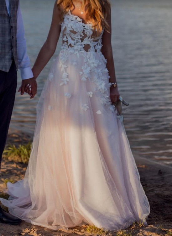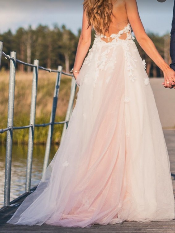 Sprzedam suknie ślubną szyta na wzór Liz Martinez Beach Wedding Dress 3D Floral V-neck. Suknia jest koloru ivory i mieni się na różowo. Góra wykonana jest z tiulu cielistego. Kwiatki są w kolorze ivory. Z tylu sukni jest doczepiany tren. Suknia była szyta na wymiary: