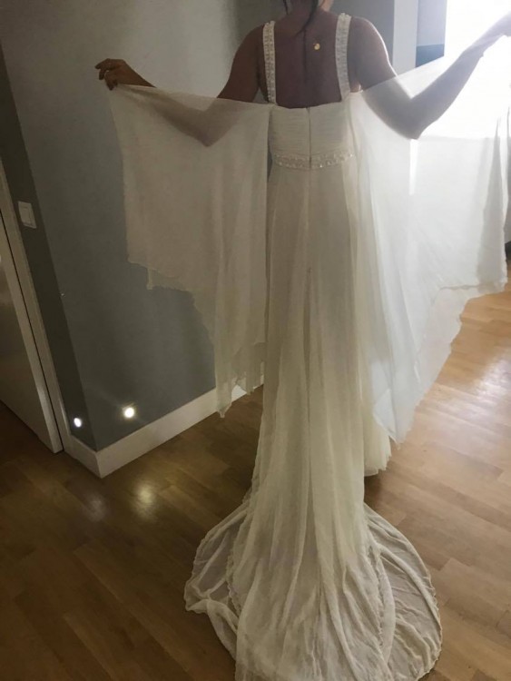 Suknia była w rozmiarze 38, ale została dopasowana (w salonie) do rozmiaru 36. Długość sukni szyta była na wzrost 167cm, + 5 cm na obcas, czyli w sumie ok. 172cm. Posiada regulację w biuście, pasie oraz w szelkach.
