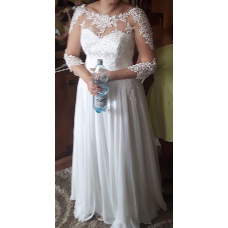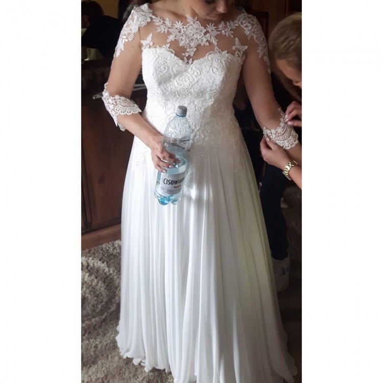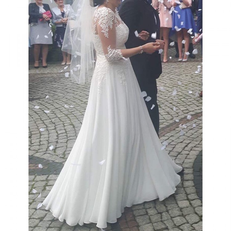 Suknia ma gorset (zapinany na suwak), dzięki któremu pięknie podkreśla biust i talię. Koronkowa góra, jak i rękawy zapinane są na ozdobne guziczki.