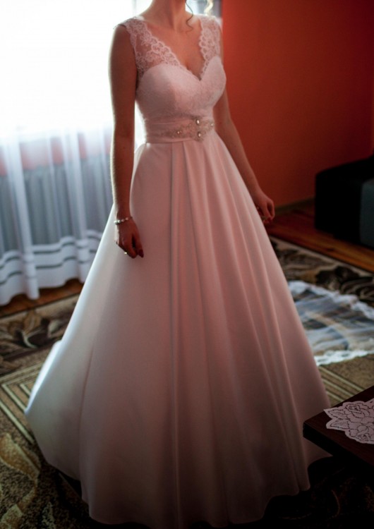 Suknia o kroju litery A z wysokogatunkowego materiału mikado, który pięknie odbija światło. Suknia posiada podpinany tren. Góra sukni wykończona delikatną koronką. W suknię wszyte poduszeczki push-up modelujące biust. Pięknie zdobiony pas podkreśla sylwetkę (z tyłu zakończony podpinaną kokardką). Suknia posiada niewidoczne kieszenie, które pomieszczą chusteczki, pomadkę.