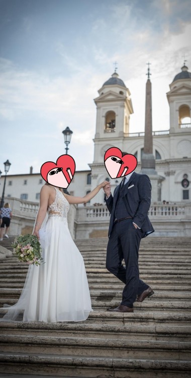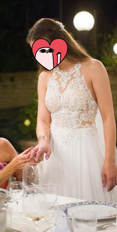 Sprzedam suknię ślubną ze zdjęcia. Suknia zakupiona w salonie sukien ślubnych w Poznaniu, dostosowana do mojej figury (poniżej moje wymiary - wymiarowanie sukni na płasko uważam za zbędne). Suknia jest niebywale lekka, ma dwie warstwy w tym wierzchnią z muślinu. Z przodu koronkowy dekolt typu halter, natomiast z tyłu głęboko wycięte plecy. Suknia jest ozdobiona kryształkami, dzięki czemu niesamowicie lśni w świetle słońca. Idealna na ślub w upalne lato - sama miałam ją na naszym ślubie w Rzymie. Suknia po czyszczeniu w pralni, brak widocznych zabrudzeń. Brak uszkodzeń, stan oceniam na idealny.