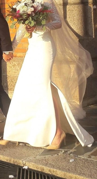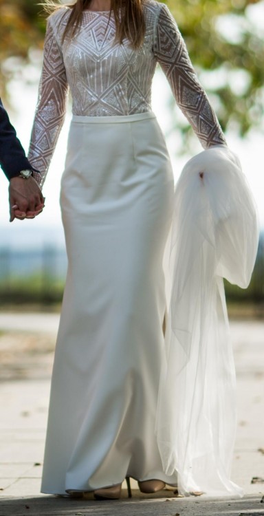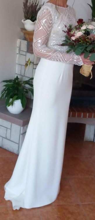 Sprzedam piękną suknię ślubną projektu Violi Piektu z kolekcji 2018. Dół sukni wykonany jest z lejącego materiału, przez co się pięknie układa, jest rozporek do kolana z lewego boku oraz tren podpinany. Góra sukni wykonana jest na szampańsko - beżowym podkładzie, wierzch zaś z ręcznie wyszywanych elementów, co przy świetle pięknie się mieni. Rękaw sukni jest długi, wykonany w szpic i wykończony mieniącymi elementami. Suknia jest z przodu zabudowana pod szyję, zaś podkład w literkę "V", plecy są do połowy wycięte, również w literkę "V'. Jest wszyty pasek, który spaja górę z dołem sukni. Doskonała na szczupłą osobę o wzroście ok. 168 cm. Do całości dołączam welon w śmietankowym kolorze o długości 2,8 cm.