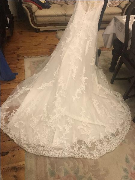 Sprzedam suknię ślubną PRONOVIAS z kolekcji 2018 r. Suknia jest w rozmiarze 40-42 (106-110 biust) szyta na ok. 170 cm z obcasami. Suknia w kształcie litery A jest pokryta przepiękną koronką i posiada tren. Kolor IVORY. Suknia jest uszkodzona w jednym miejscu - powiększona delikatna dziurka przy podpince do trenu (zdjęcie). Koszt naprawy u krawcowej 100 zł. Suknia bardzo wygodna, lekka. Zachęcam. Cena do negocjacji!