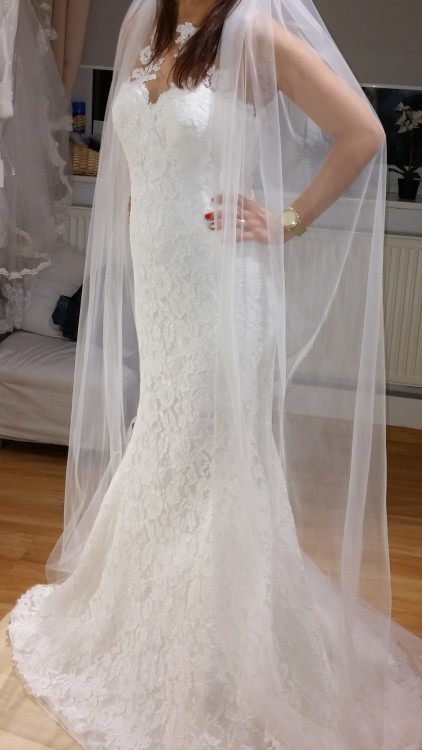 Sprzedam suknie ślubną z welonem - suknia firmy Pronovias Barcelona. Przepiękna suknia koronkowa w stylu hiszpańskim z trenem (tren jest podpinany). Sukienka posiada wszyte wkładki jako biustonosz.