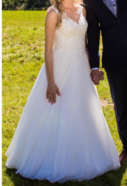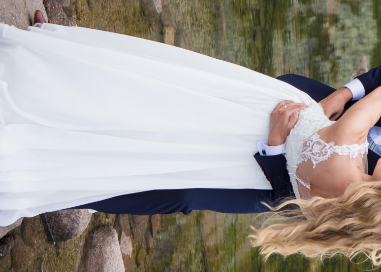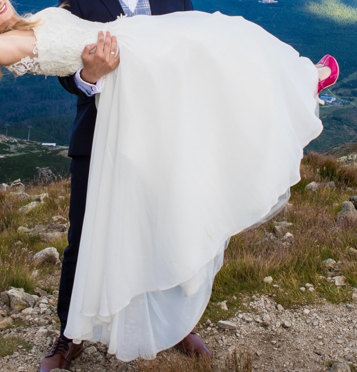 Sprzedam śliczną muślinową suknię ślubną szytą na zamówienie: wzrost 162 cm, obcas 7 cm. Rozmiar sukni to ok. 36, ale jest możliwość lekkiego poszerzenia jej na bokach.