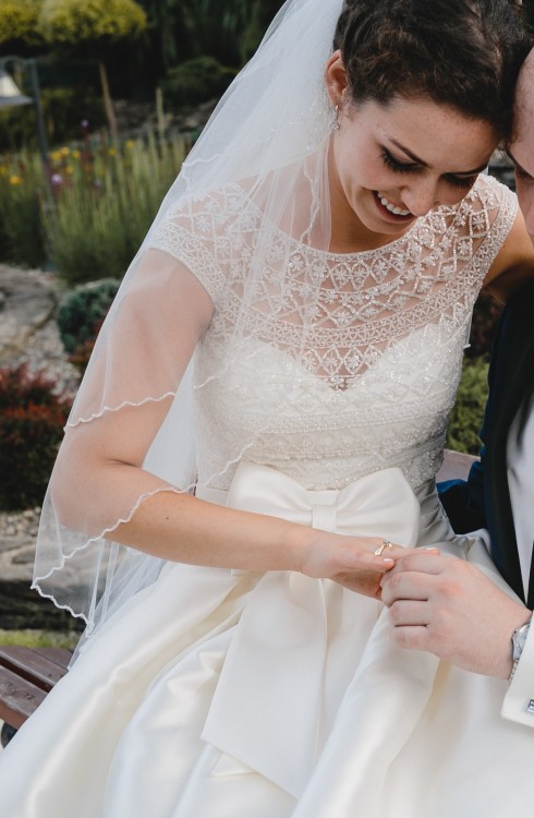 Suknia miała dwie możliwości wyboru materiału. Albo taki wytłaczany albo mikado. Ja wybrałam model w wersji mikado, ponieważ zdecydowanie lepiej się układał, a kryształki na tym materiale lepiej się szkliły. Poza tym mikado to wysokiej jakości jedwab, który jest bardzo komfortowy w noszeniu, przewiewny, naturalny materiał bez żadnych poliestrów w których się można ugotować , dosłownie ;)