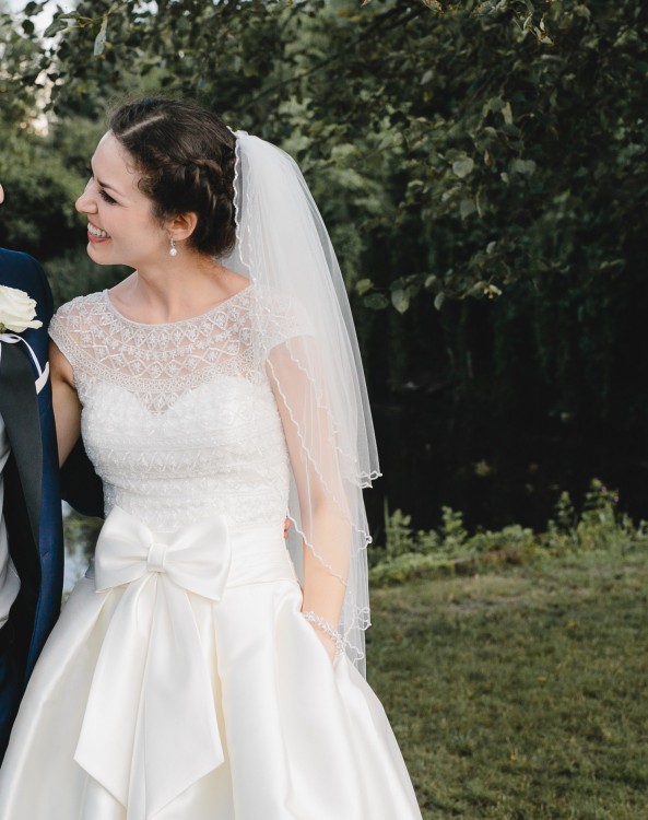Suknia ma niewielki tren, który bardzo prosto i wygodnie podwija się pod sukienkę, nie widać nic zupełnie :) Suknia na kole, ponieważ zdecydowanie lepiej się układa.