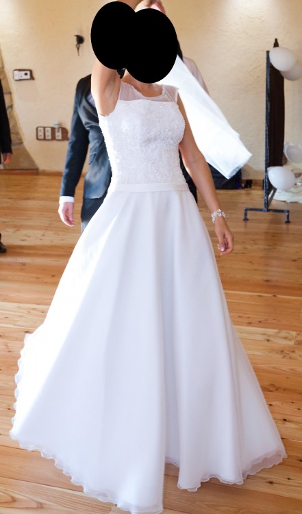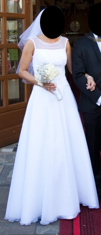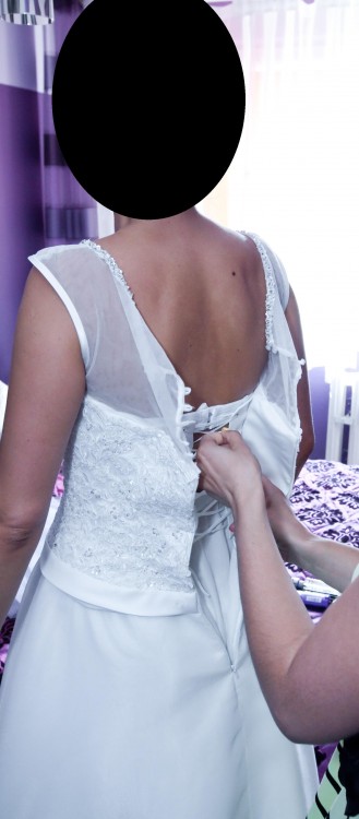 Do sprzedania mam białą suknię ślubną z kryształkami na gorsecie. Rozmiar pasuje na 38.