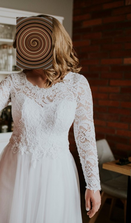 Dół sukienki ślubnej wykończony przepięknym lekkim tiulem.