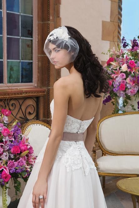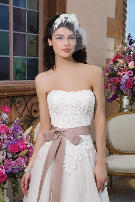 Suknia o długości 3/4 wykonana z bardzo dobrej jakości tiulu, gorset pokryty bawełnianą koronką kordonkową. Kolor katalogowy to sand/mocha. Suknia posiada kolorowy akcent w postaci odpinanej kokardy w kolorze mokka. Suknia zasuwana na zamek, dodatkowo posiada guziczki obszyte tkaniną.