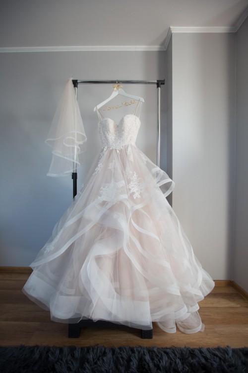 Do sukienki dodatkowo został wszyty pas, dzięki któremu nie czuć dyskomfortu spadania gorsetu. W komplecie do sukni są cienkie, odpinane ramiączka oraz wszyte miseczki.