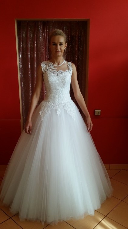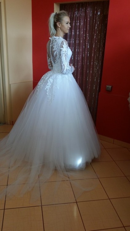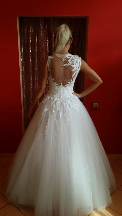 Zapinana na suwak i guziczki. Dół sukni wykonany z kilku warstw satyny oraz tafty inteligentnej, wierzch z tiulu – przed ostatnia wartwa z błyszczącego przez co suknia pięknie się błyszczy.