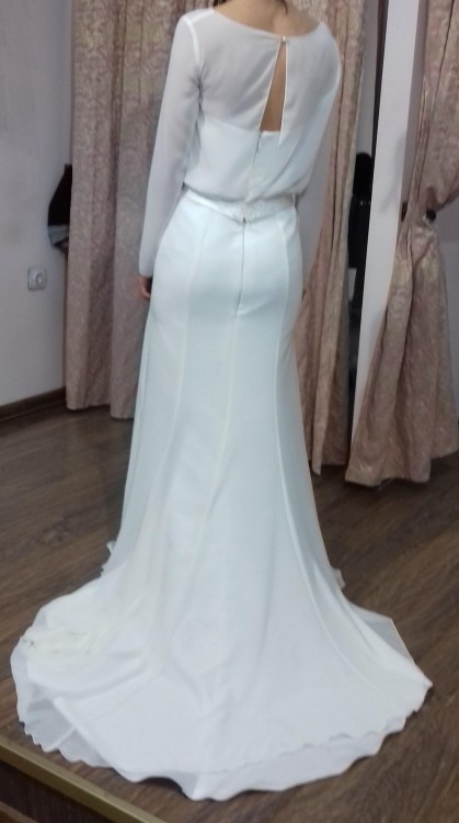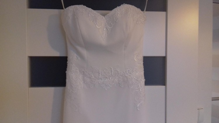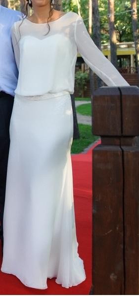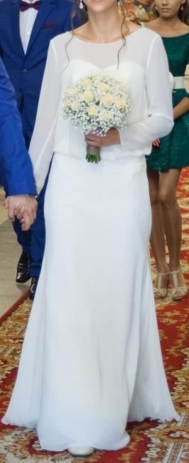 Sprzedam elegancką, prostą suknię w kolorze "bitej śmietany". Suknia ma dwie odsłony: z bluzką lub bez. Na biuście, biodrach oraz pasie bluzki są spójne ozdobne naszycia. Suknia jest uszyta na wzrost 173cm. Suknia założona raz (sierpień 2017). Możliwość przymiarki w Warszawie, Wyszkowie, okolicach Piaseczna.