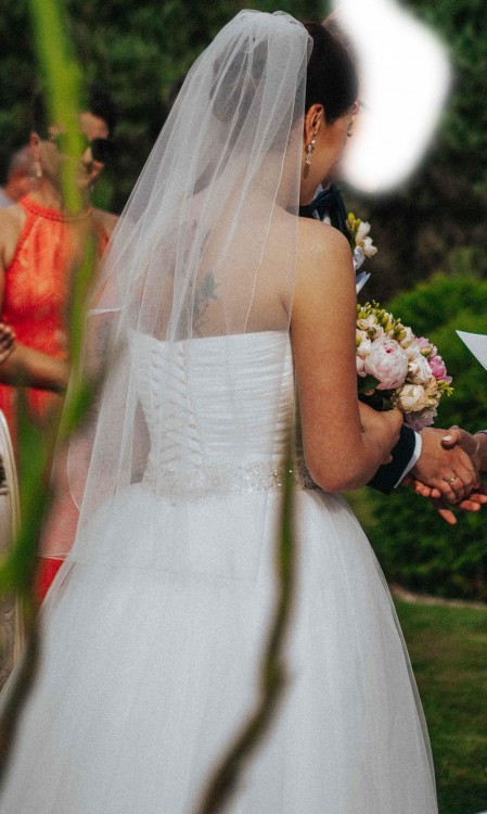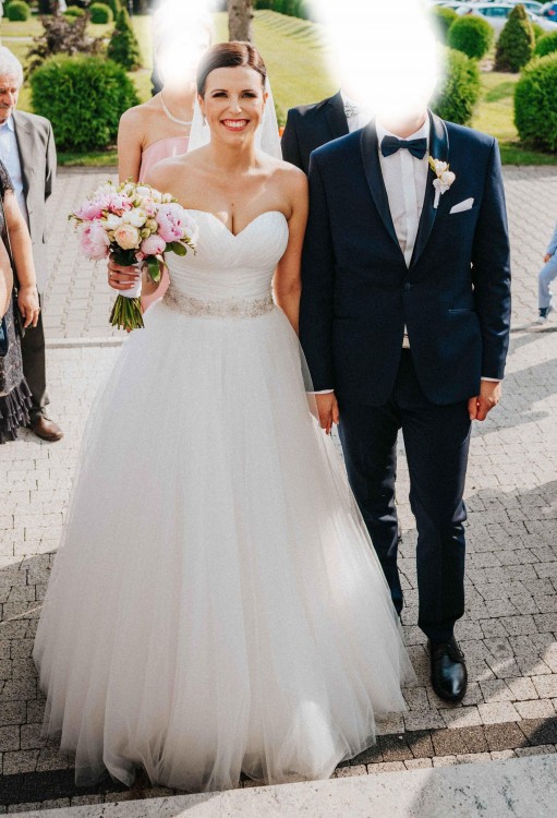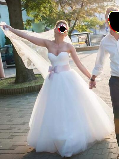 Suknia oryginalnie z kokardą w kolorze pudrowego różu. Pasek i kokarda na zatrzaski, można np po oczepinach je zamienić lub na sesji część zdjęć mieć z kokardą a część z paskiem. Pasek prezentuje się królewsko i był bardzo drogi ;-). Welon jak na zdjęciu + halka na kole (koło można łatwo wyjąć i mamy zwykłą halkę jeśli ktoś chce mniej obszernej sukni). W razie pytań służę pomocą. Cena zestawu jaką zapłaciłam w sklepie to 5.500 zł