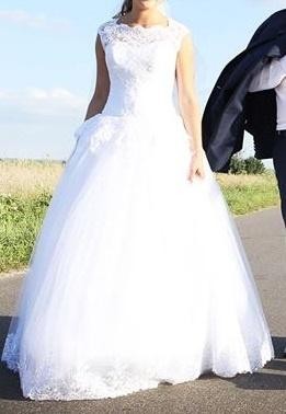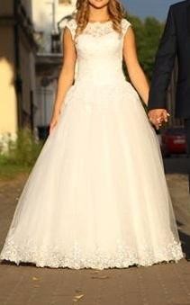 Sprzedam suknię ślubną w rozmiarze od 36 do 40. Wzrost około 167 (+-5cm) plus obcas. Suknia regulowana- wiązana z tyłu.