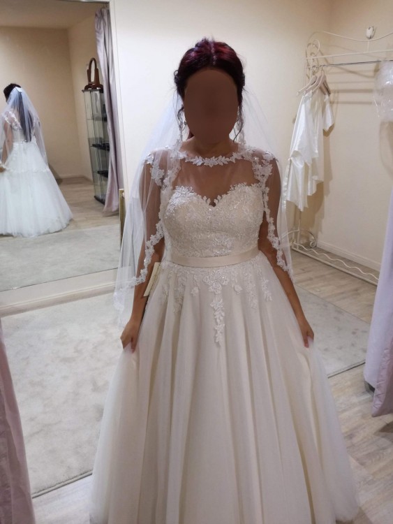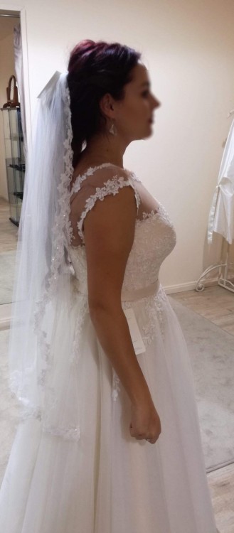 Suknia została założona 2 razy - w dniu ślubu oraz podczas sesji plenerowej - została wyprana w profesjonalnej pralni salonu Agnes. Uważam, że suknia jest w znakomitym stanie, nie posiada śladów użytkowania, dziurek czy rozdarć. Koronkowa góra jest bez jakichkolwiek zaciągnięć.