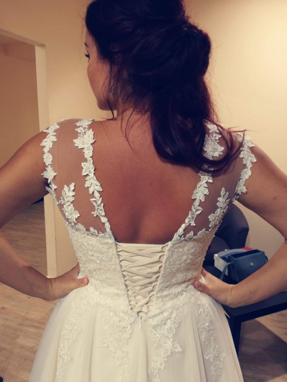 Suknia jest bardzo wygodna i lekka. Gorset posiada beżowo-kremowy odcień, wykończony delikatną siateczką wraz z przepiękną koronką, która w elegancji sposób przechodzi poniżej talii.