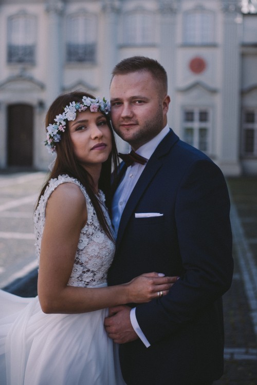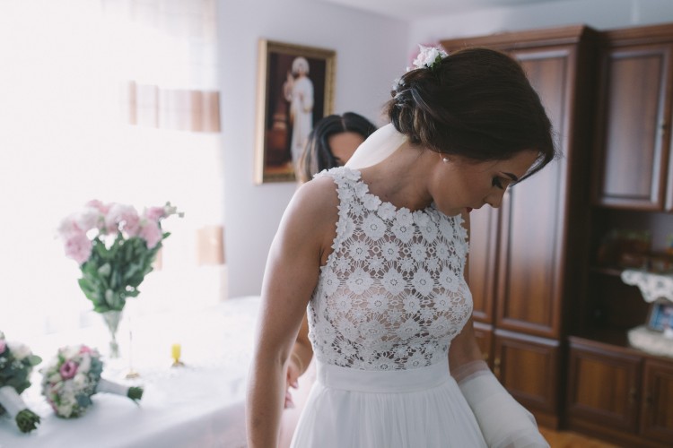 Sukienka posiada głęboki dekolt na plecach który wykończony jest bawełnianą koronką. W suknie wszyte są miseczki ale można je bez problemu odpruć. Suknia posiada długi muślinowy dół,który jest podpinany. Do sukni dorzucam welon 2 m. Więcej informacji udzielę telefoniczne.