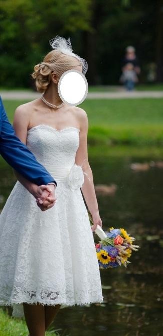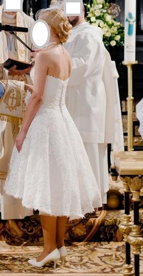 Sprzedam piękną sukienkę Justina Alexandra, skrócona lekko za kolana,jak na zdjęciu. Koronka nie tuzinkowa! Robi wrażenie! Sukienka jest w bardzo dobrym stanie. Rozmiar 36/38. Możliwość powiększenia (trochę ja zmniejszałam i krawcowa zrobiła to tak, żeby ktoś mógł ją ewentualnie powiększyć). Posiadam jeszcze koronkę z sukienki. Można wykorzystać na uszycie np. bolerka, rękawiczek etc. W tej sukience można czuć się naprawdę wyjątkowo!! :) Posiadam jeszcze na sprzedaż woalkę widoczną na zdjęciu.