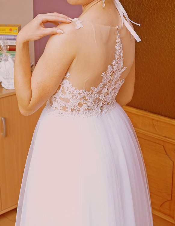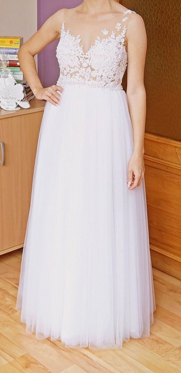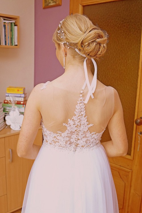 Suknia była szyta u krawcowej na wzór modelu Chelsea marki Milla Nova (spódnica jest tylko prosta, ale można ubrać pod nią halkę). Koronka ma delikatne cekiny, na biuście dodatkowo wszyta jest grubsza koronka z perełkami, w pasie jest pasek z perełek. Suknia ma już wszyte miseczki. Rozmiar sukni to 34/36, 164 cm (w tym wliczony obcas 5 cm). Gorąco polecam, gdyż suknia służyła mi cały dzień, jest bardzo lekka i wygodna, nie musiałam jej ani razu poprawiać. Dodatkowo dodaje do niej w gratisie stroik do włosów. CENA- 1000 zł (cena bez czyszczenia w pralni). Możliwość przymiarki w Kaszczorze.