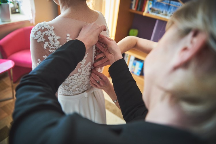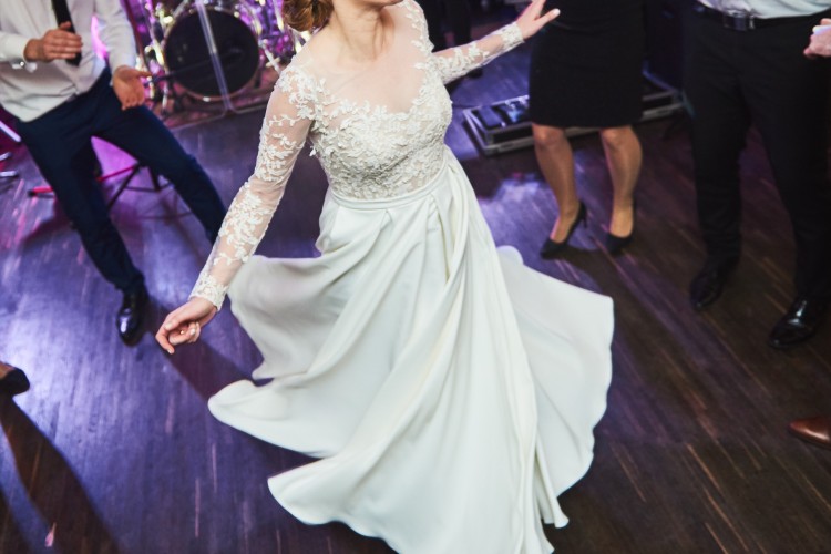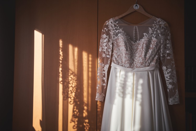 Suknia ma piękne, długie koronkowe rękawy, cielisty gorset z ładnie wyciętymi plecami w literę V. Dół sukni jest mocno marszczony przez co suknia pięknie podkreśla talię a w tańcu daje niesamowity efekt. Krepa jest materiałem sprężystym i dość odpornym na gniecenie.