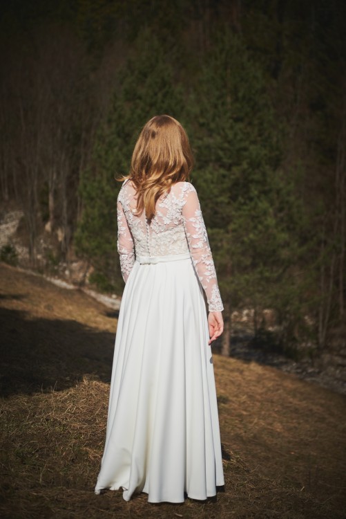 Góra sukni wykonana jest z ręcznie przyszywanej koronki, dekolt wykończony perłową siateczką, zapinana na guziki. Dół sukni uszyty jest z krepy w tym samym kolorze, w tali pasek, z tyłu zapinany na zatrzask z kokardką. Suknię z łatwością można skrócić lub zwęzić gorset. Połączenie ręcznie wyszywanej, delikatnej koronki oraz krepy sprawia, że suknia idealnie pasuje na ślub jesienny i zimowy.