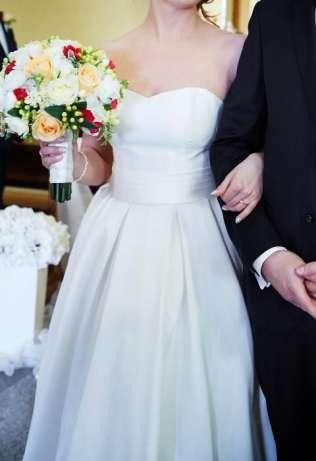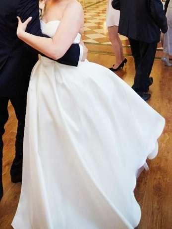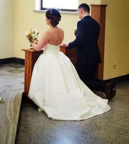 ślubu chcą czuć się przede wszystkim wyjątkowo i niepowtarzalnie, oraz pragną wzbudzić zachwyt wszystkich gości. Jeśli znudziły Ci się koronki, to dobrze trafiłaś, bo na całej sukience, nie ma ich wcale;) Suknia jest prosta, ale za to klasyczna i ponadczasowa. Wykonana z tkaniny mikado- jedwab, posiada ukryte kieszenie, ma wszytą halkę i usztywniany biustonosz, co jest dużym ułatwieniem dla jej użytkowniczki. Kupiona w rozmiarze 36/38 na wzrost 169cm + 8 cm obcas (możliwość skrócenia). Pięknie prezentuje się w tańcu, ale również w bezruchu. Ma dekolt wycięty w lekkie serduszko i mocno wycięte plecy, od środka zapinana jest na zamek błyskawiczny, który jest niewidoczny i dodatkowo przykryty delikatnym pasem w talii.