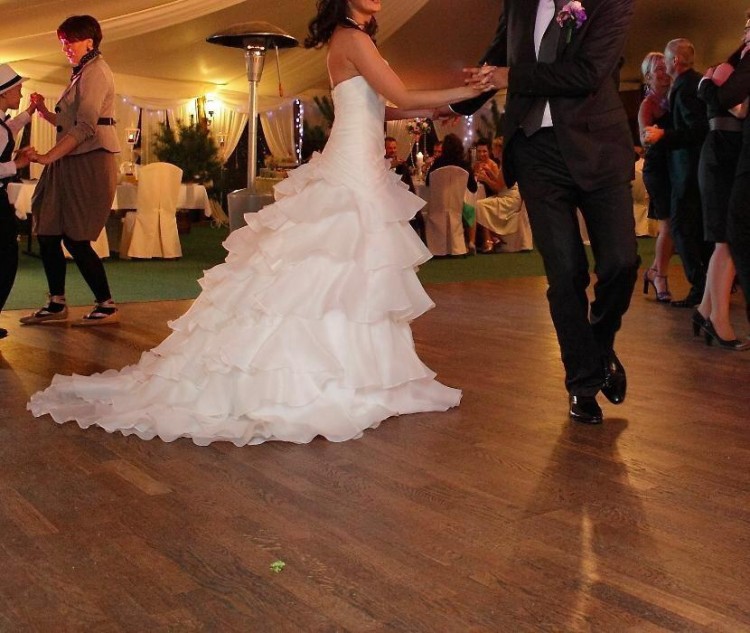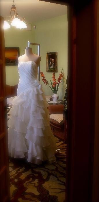 Gratis dorzucam wdzianko oraz halkę - koło (również zakupione w tym salonie). Suknia prezentuje się bardzo efektownie - posiadam sporo zdjęć z uroczystości, którymi chętnie się podzielę.