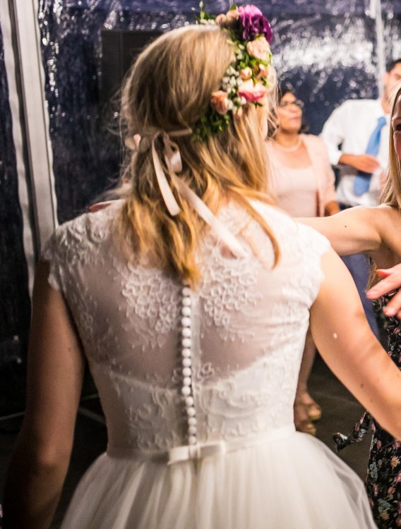 Największą zaletą sukni jest wbudowany gorset, jest wiązany idealnie do sylwestki, natomiast przy wiązaniu znajdują sie wbudowane paski na biustonosz by ten nie miał szans przesunąć się do góry , suknia na tyle dobrze "trzyma" że można też spróbować bez biustonosza. Na plecach znajduje się głęboko wykrojona koronka oraz pas modnych guziczków, zakończone uroczą mini kokardką. Suknia uszyta na 164 cm + 8 cm obcasa.