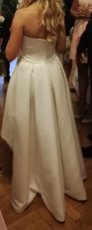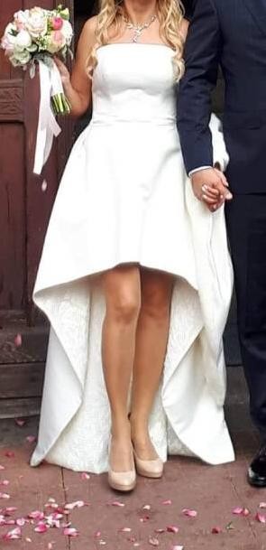 Sprzedam elegancką sukienkę zakupioną w 2018 roku w firmowym salonie Madonna w Gdyni. Sukienka jest asymetryczna - krótka z przodu co idealnie podkreśla zgrabne nogi i długa z tyłu.