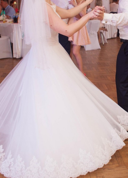 Suknia w kolorze bieli w kształcie literki A. Góra i dół sukni ozdobiona jest romantyczną subtelną bawełnianą koronką, która pięknie się prezentuje i nie drażni skóry. Suknia jest bardzo lekka i wygodna, nie krepuje ruchów i efektownie układa się w tańcu goście byli zachwyceni :) Suknia została zakupiona za cenę 3550 zł. Suknie sprzedam za 800zł, welon do sukni gratis. W razie pytań prześlę więcej zdjęć i informacji. Istnieje możliwość przymierzenia. Kontakt 889-373-890 .