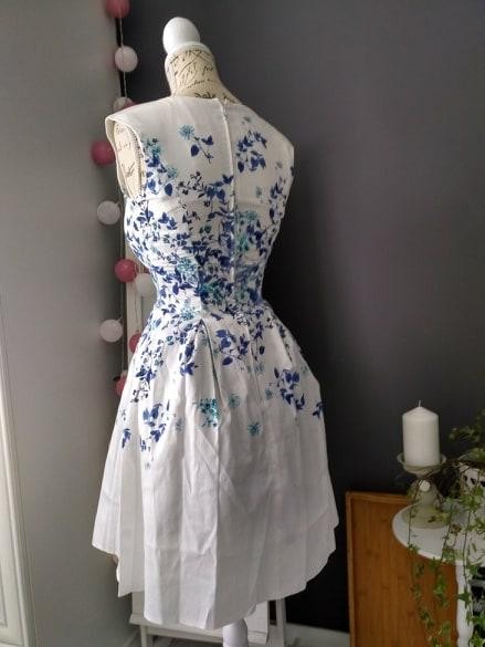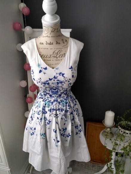 Sukienka długość do kolan dla szczupłych Pań, może posłużyć jako kreacja na ślub cywilny, na poprawiny po weselu, lub dodatkowa sukienka na czas przyjęcia weselnego, jako lżejsza mniej formalna opcja dla Panny Młodej. Sukienka z metki producenta rozmiar europejski 32, bardzo proszę sprawdzić wyżej podane wymiary długości i szerokości. Wymiary pobrane z sukienki w pozycji leżącej, zapewne, jako że jest to bawełna nieco się podda, ale nie jest to materiał mocno elastyczny i Panie noszące na co dzień rozmiar 36 prawdopodobnie w nią wejdą, ale będą wstrzymywać oddech, dlatego polecam jedynie drobnym osoba miedzy 32-34. Możliwy odbiór osobisty na terenie Rybnika.