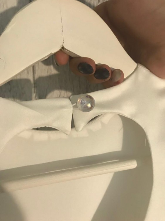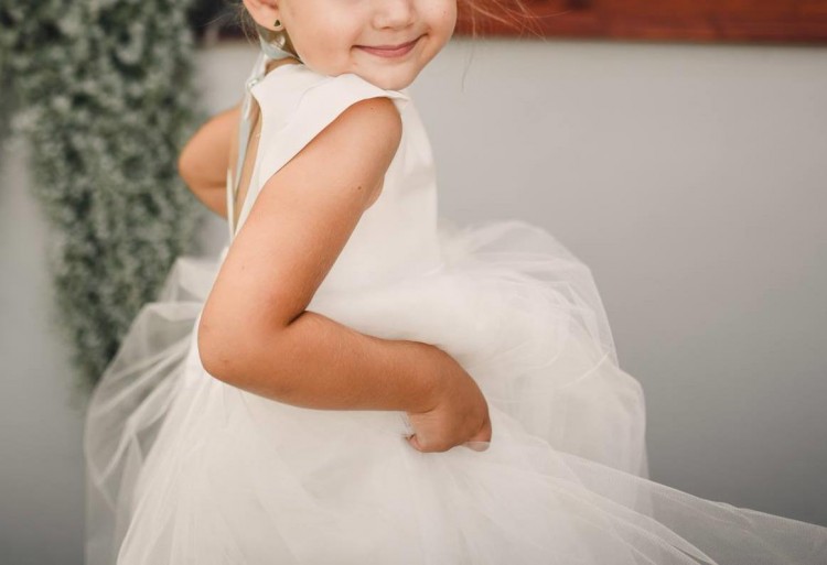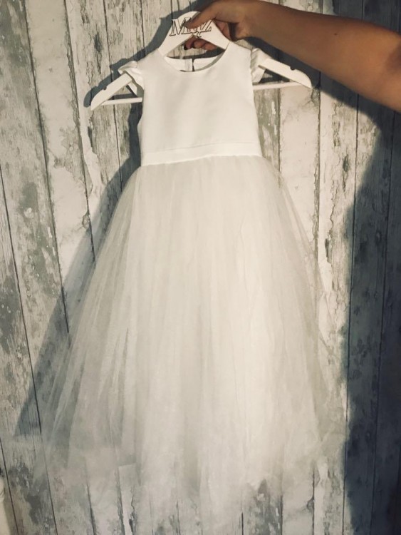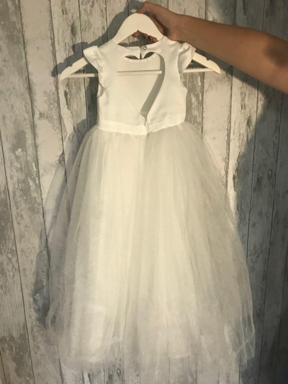 długość (mierzona od ramienia do ziemi) - 97cm. Według metki jest to rozmiar 110, sukienka zamawiana indywidualnie, z racji, ze zależało mi aby sukienka była długa(maxi). Kolor biały, dół tiulowy, w razie gdyby była za długa można ją skrócić samemu. Kokardka z tyłu odczepiana, sukienka zapinana na guziczek i zamek kryty. Na plecach urocze wycięcie w kształcie serca, założona raz, w dniu ślubu. Polecam serdecznie, wszyscy byli zachwyceni! :)
