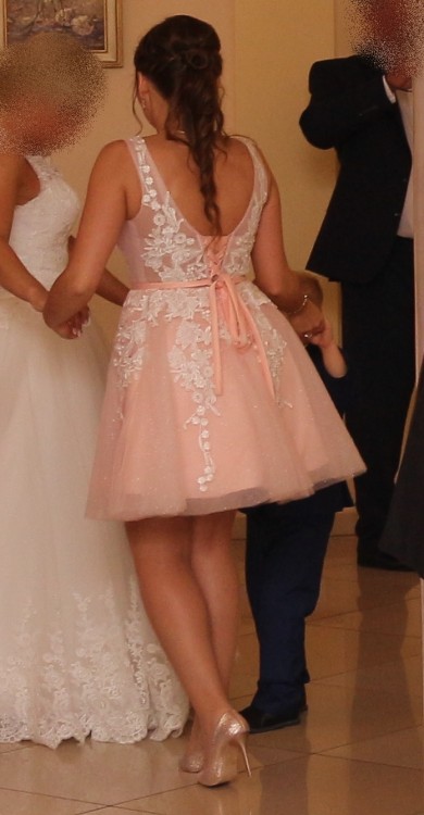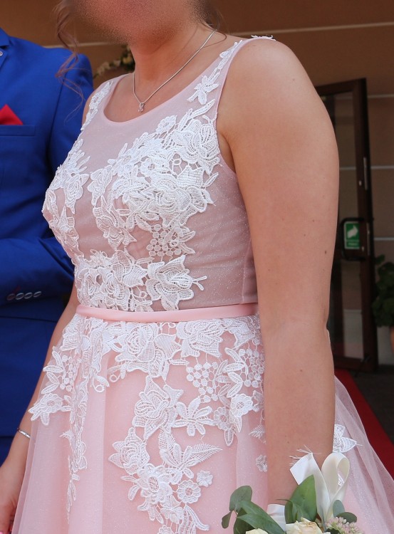 Sukienka z firmy Pretty Women, zakupiona w ekskluzywnym sklepie Passero w Katowicach. Rozmiar sukienki z metki to 36 (ja noszę 34/36). Przy moim wzroście 162cm, sukienka sięga mi przed kolano. Wykonana jest bardzo starannie. Z tyłu częściowo zasuwana na zamek, wyżej sznurowania gorsetowo, co pozwala idealnie dopasować ją do sylwetki. Pięknie eksponuje plecy. Kolor ciężko określić jednoznacznie, jest to odcień różu i brzoskwiniowego. Koronka w kolorze śmietankowym. Dół sukienki rozkloszowany, składa się z kilku warstw tiulu i podszewki. Jedna z warstw tiulu jest ze srebrnym brokatem, dzięki czemu sukienka mieni się delikatnie w świetle.
